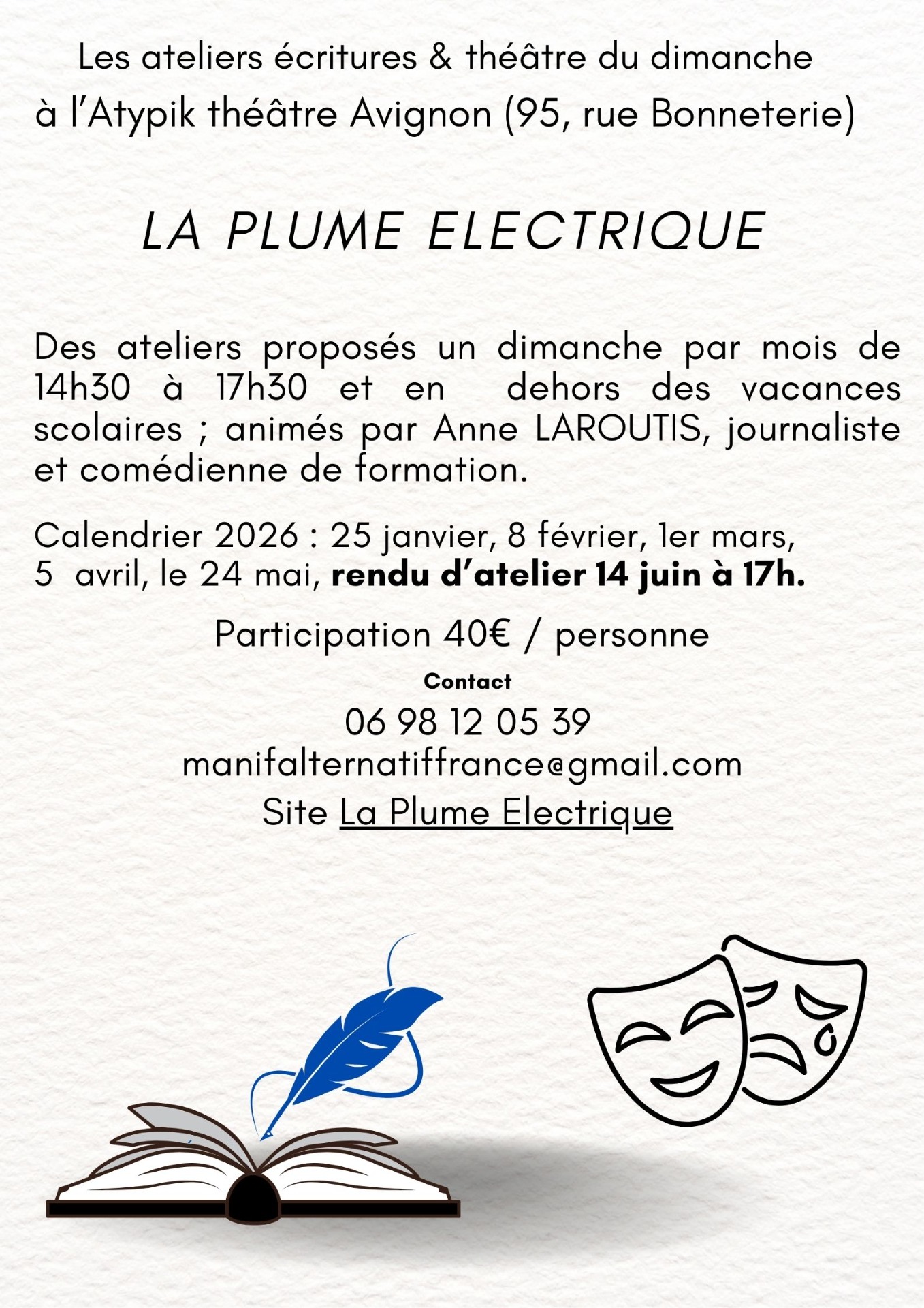 Dans le cadre de l'activité de la Plume Electrique animé par Anne LAROUTIS en théâtre et écriture, journaliste et formatrice (animation CLAE Sorgues), elle met en place des ateliers un dimanche par mois de 14h30 à 17h30, pour créer des rendus d'atelier qui mettent en valeur la capacité de chacun.e à "faire société" à la fin de chaque saison théâtrale ( c'est à dire, en juin de chaque année) .